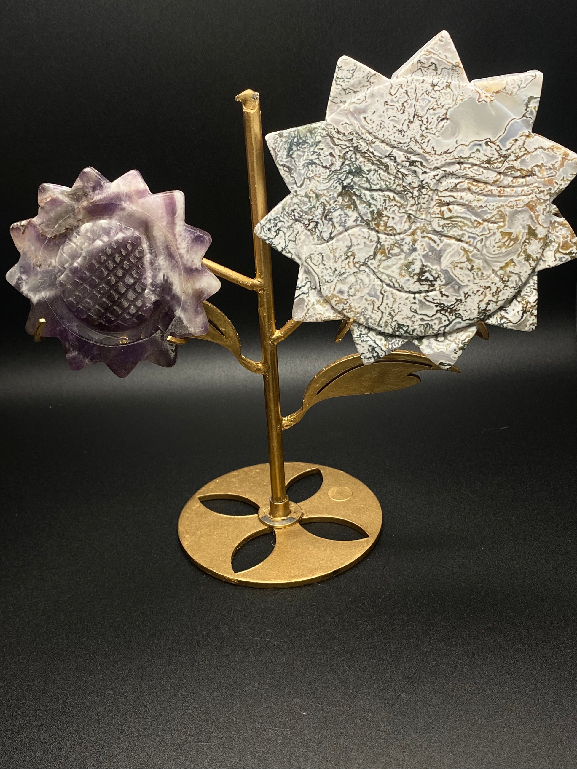 This enchanting floral display weighs 0.91 lbs and features two intricately carved crystal flowers—one in soothing moss agate and the other in dreamy amethyst. Set on a golden metal stand, these flowers combine natural beauty with artistic craftsmanship, making it a stunning piece of décor and a powerful energetic tool.