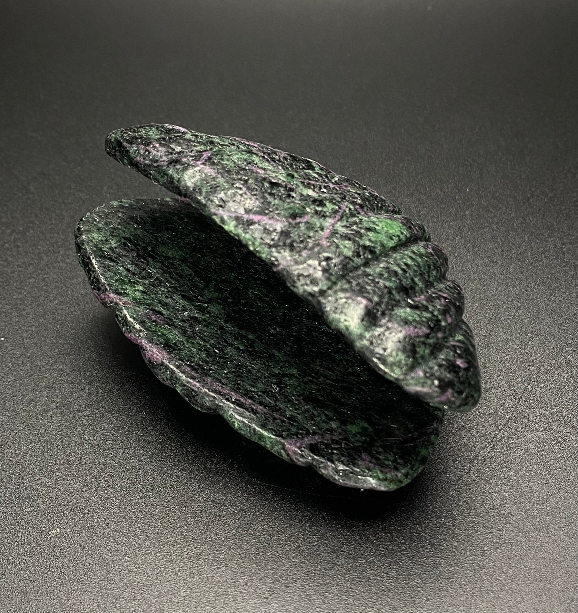 This 0.56 lb Ruby Zoisite clam shell carving is a one-of-a-kind piece, combining artistry with the natural beauty of ruby and zoisite.