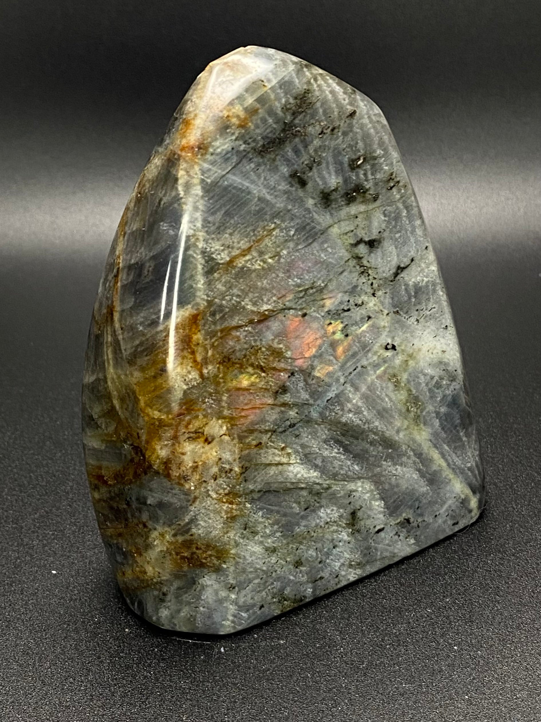 This 1.25 lb sunset labradorite freeform is a one-of-a-kind crystal, glowing with fiery flashes that make it truly magical.