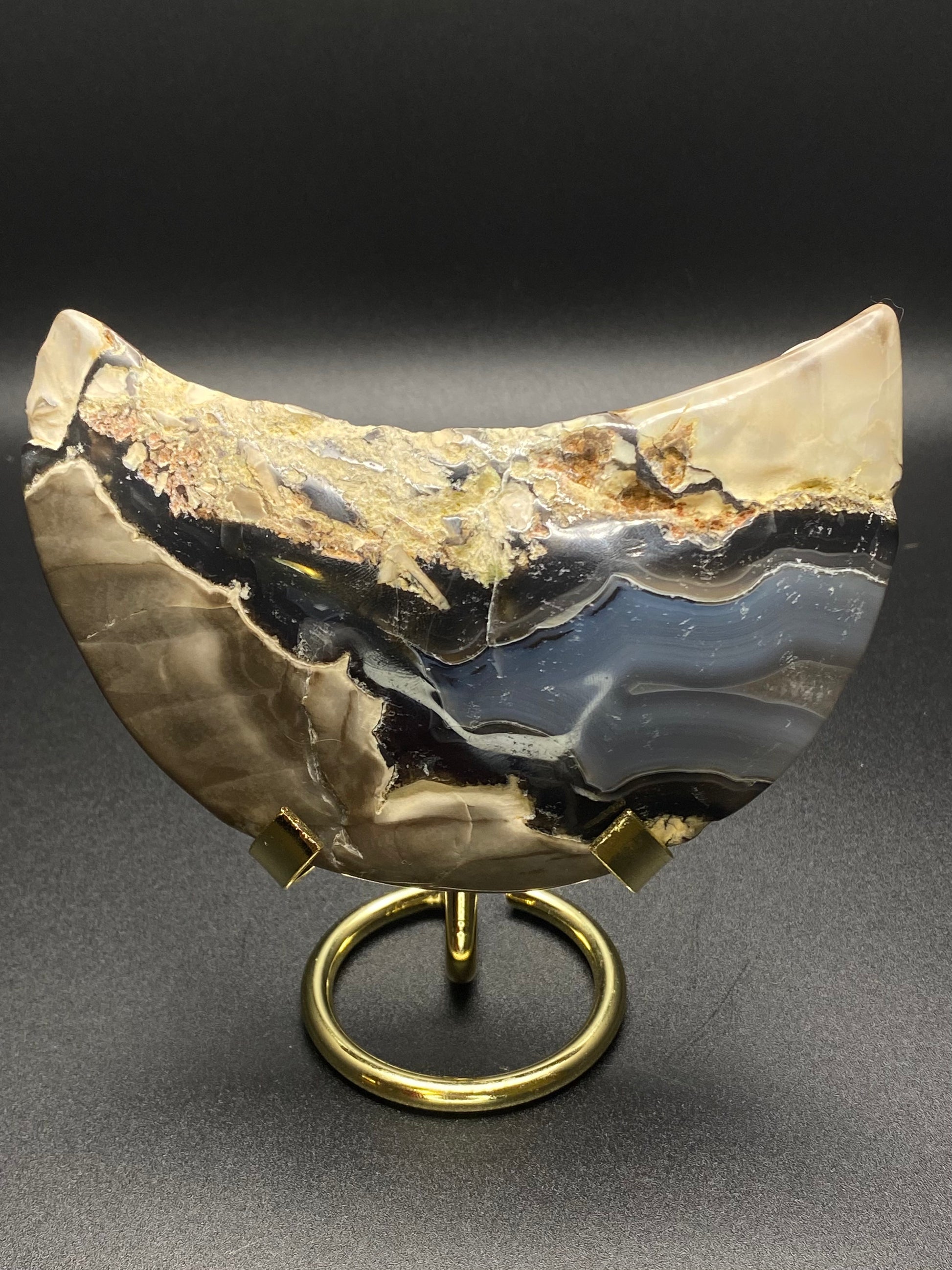 This stunning Volcanic Agate moon carving weighs 1.1 lbs and comes with a sleek stand for display. Its dramatic mix of smoky grays, deep blacks, and creamy neutrals is accented by raw natural textures across the top, giving it a striking organic look. Under UV light, this piece reveals a glowing fluorescence, adding an extra layer of rarity and beauty.